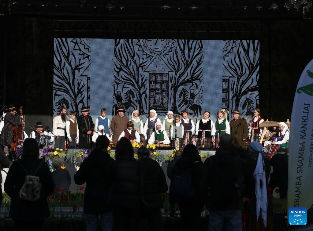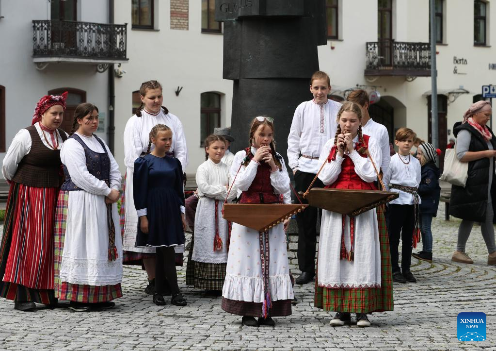 A folklore ensemble concert is held during the 49th International Folklore Festival in Vilnius, Lithuania, on May 28, 2022. The 49th International Folklore Festival, one of the few authentic ethnic music festivals in Europe, wrapped up here in Vilnius on Sunday. (Xinhua/Xue Dongmei)