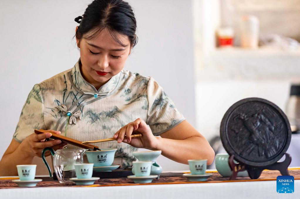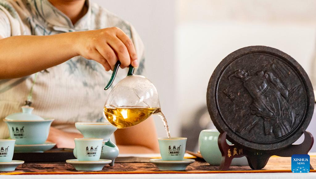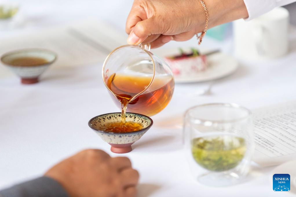The Chinese tea-serving ceremony and tasting took place during the "Tea for Harmony" cultural salon on Friday in the English city of Bath. The salon featured various tea and tea culture from Hubei Province, central China, including black brick tea, Yihong black tea and Enshi Yulu Tea.