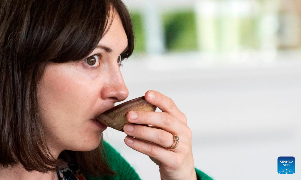 A guest tastes Yihong black tea during the "Tea for Harmony" cultural salon in Bath, Britain, May 24, 2024. (Photo by Stephen Chung/Xinhua)