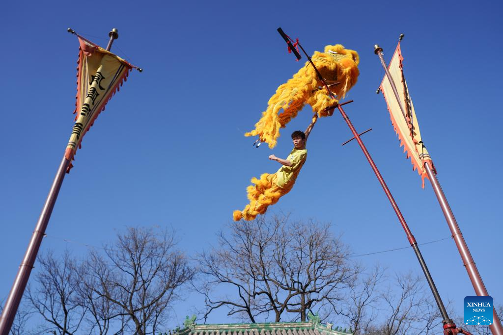 Artists stage a lion dance performance at a temple fair in Beijing, capital of China, Feb. 17, 2026. Temple fairs opened here celebrating the Spring Festival and presenting visitors with traditional dances, lion dances and delicious food. (Xinhua/Chen Zhonghao)