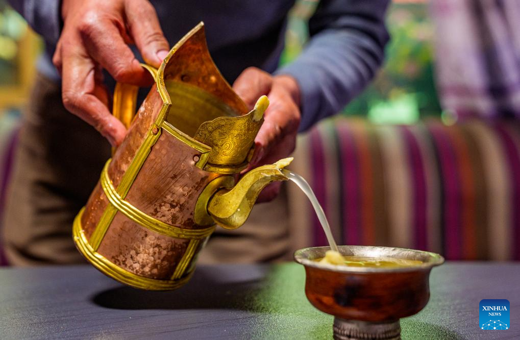 Chocho prepares a "chema" at his home in Lhasa, southwest China's Xizang Autonomous Region, Feb. 16, 2026.