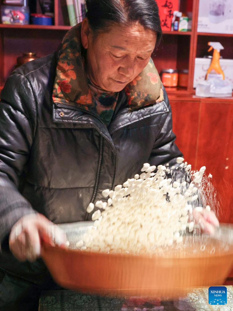 Chocho's wife Tasang (L) prepares "gutu" at their home in Lhasa, southwest China's Xizang Autonomous Region, Feb. 16, 2026.