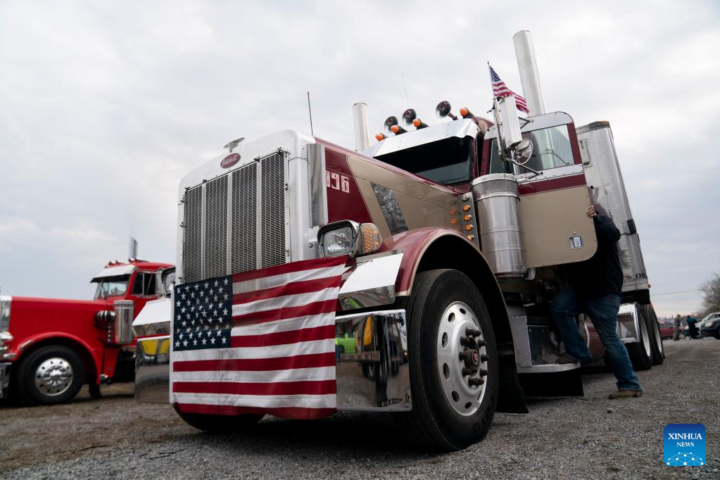 Trucks and other cars gather during a truck convoy protest against COVID-19 restrictions in Hagerstown, Maryland, the United States, on March 6, 2022. (Xinhua/Liu Jie)