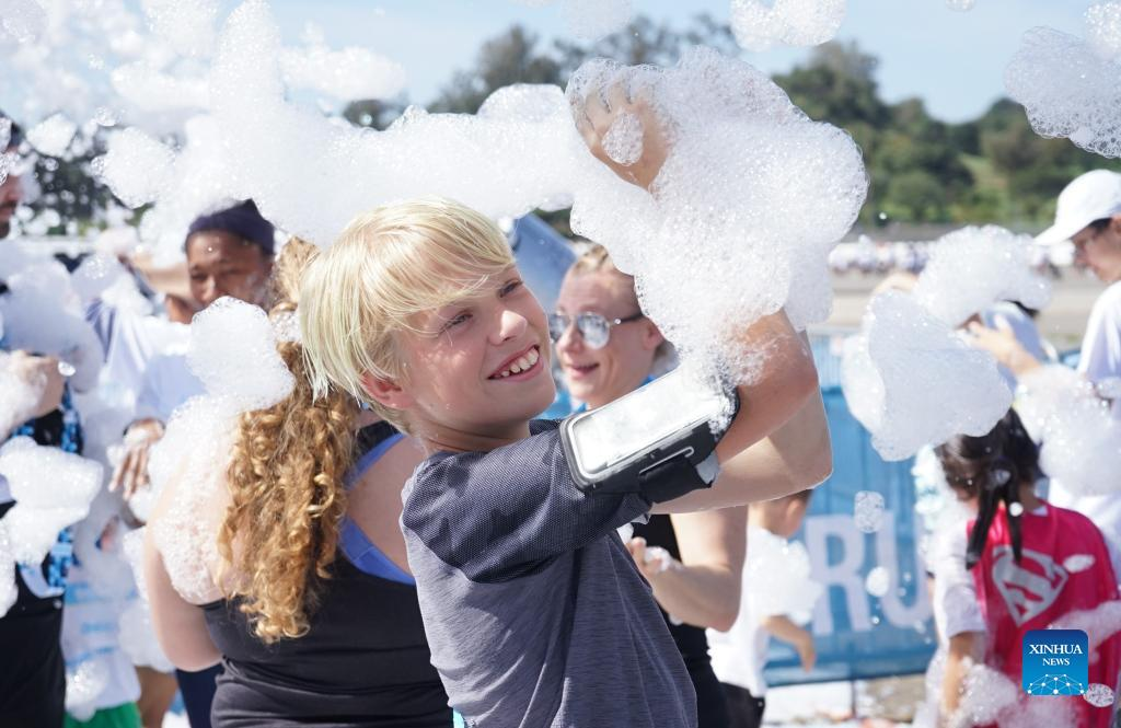 People participate in the Bubble Run in Pomona, Los Angeles County, California, the United States, April 9, 2022. Thousands of people joined an annual five-kilometer Bubble Run in Pomona in Southern California on Saturday. (Photo by Zeng Hui/Xinhua)