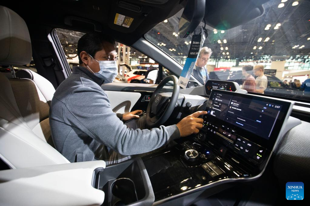 Visitors look at an all-electric car of Toyota at the New York International Auto Show in New York, the United States, April 15, 2022. The New York International Auto Show (NYIAS) staged a comeback and opened to the general public on Friday after two years of interruption amid the COVID-19 pandemic.