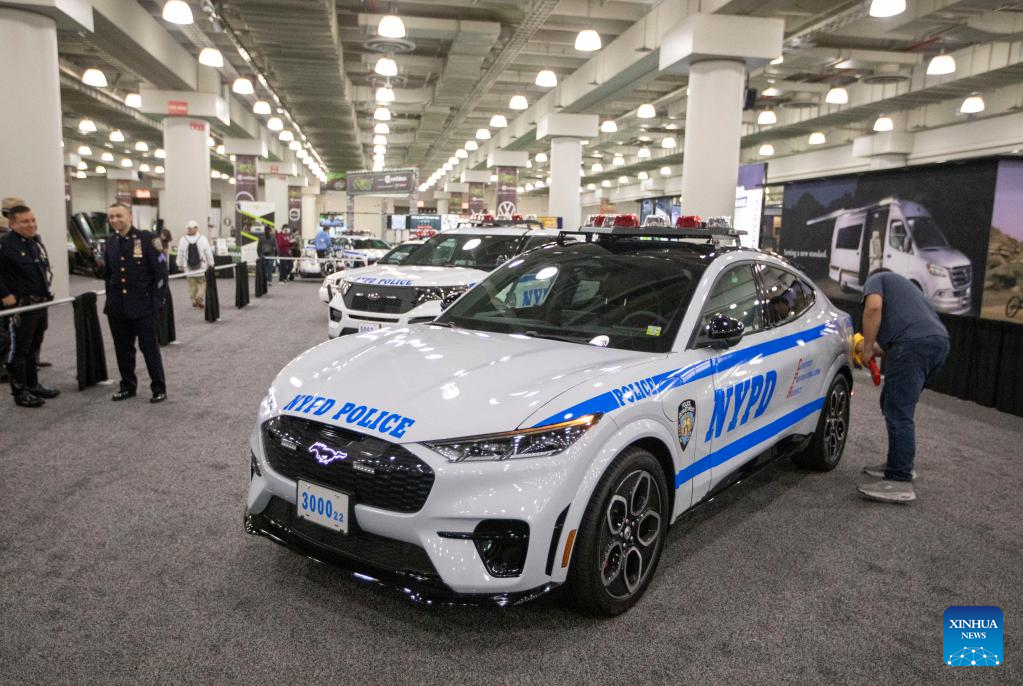 An electric police car is on display at the New York International Auto Show in New York, the United States, April 15, 2022. The New York International Auto Show (NYIAS) staged a comeback and opened to the general public on Friday after two years of interruption amid the COVID-19 pandemic.