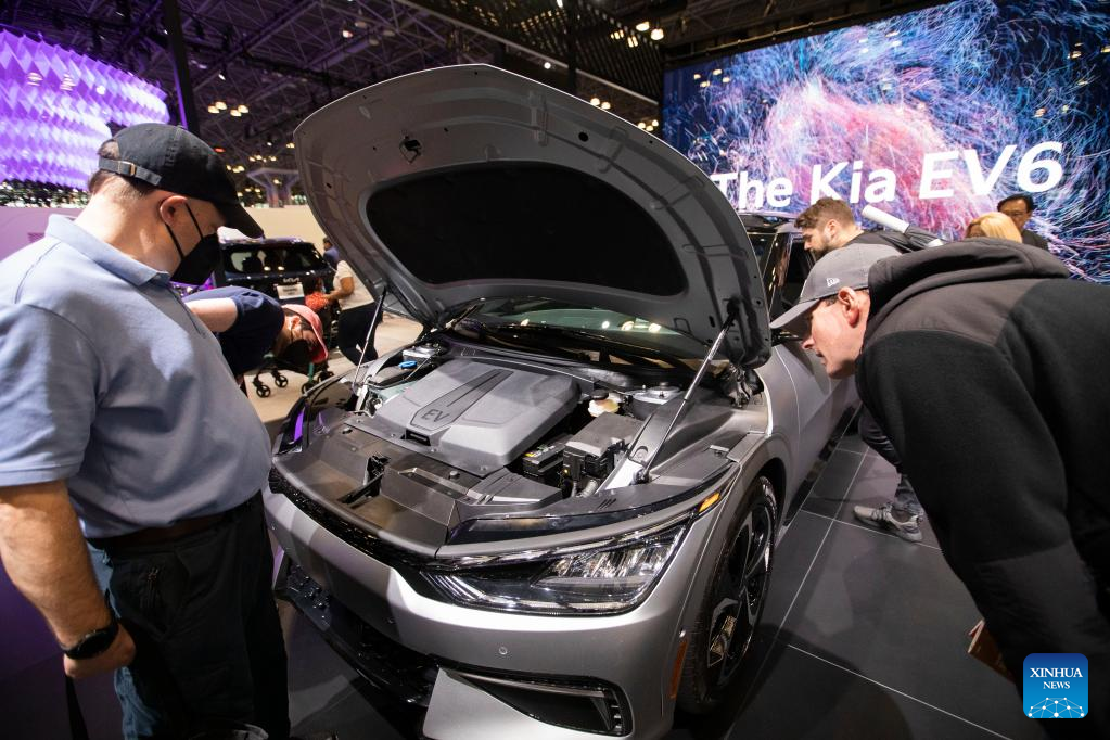 Visitors look at an all-electric car of Kia at the New York International Auto Show in New York, the United States, April 15, 2022. The New York International Auto Show (NYIAS) staged a comeback and opened to the general public on Friday after two years of interruption amid the COVID-19 pandemic.