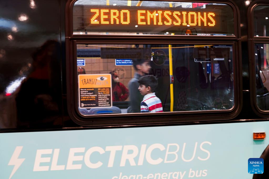 Visitors look at an electric bus at the New York International Auto Show in New York, the United States, April 15, 2022. The New York International Auto Show (NYIAS) staged a comeback and opened to the general public on Friday after two years of interruption amid the COVID-19 pandemic.