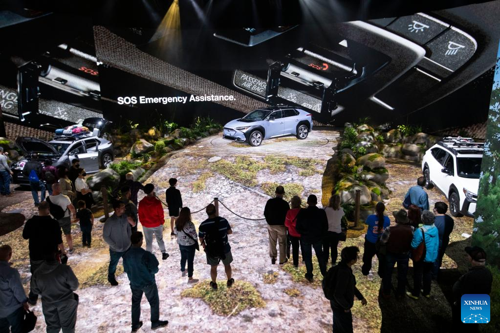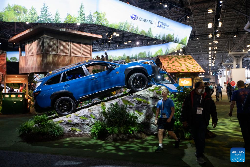 Visitors look at an all-electric SUV of Subaru at the New York International Auto Show in New York, the United States, April 15, 2022. The New York International Auto Show (NYIAS) staged a comeback and opened to the general public on Friday after two years of interruption amid the COVID-19 pandemic.