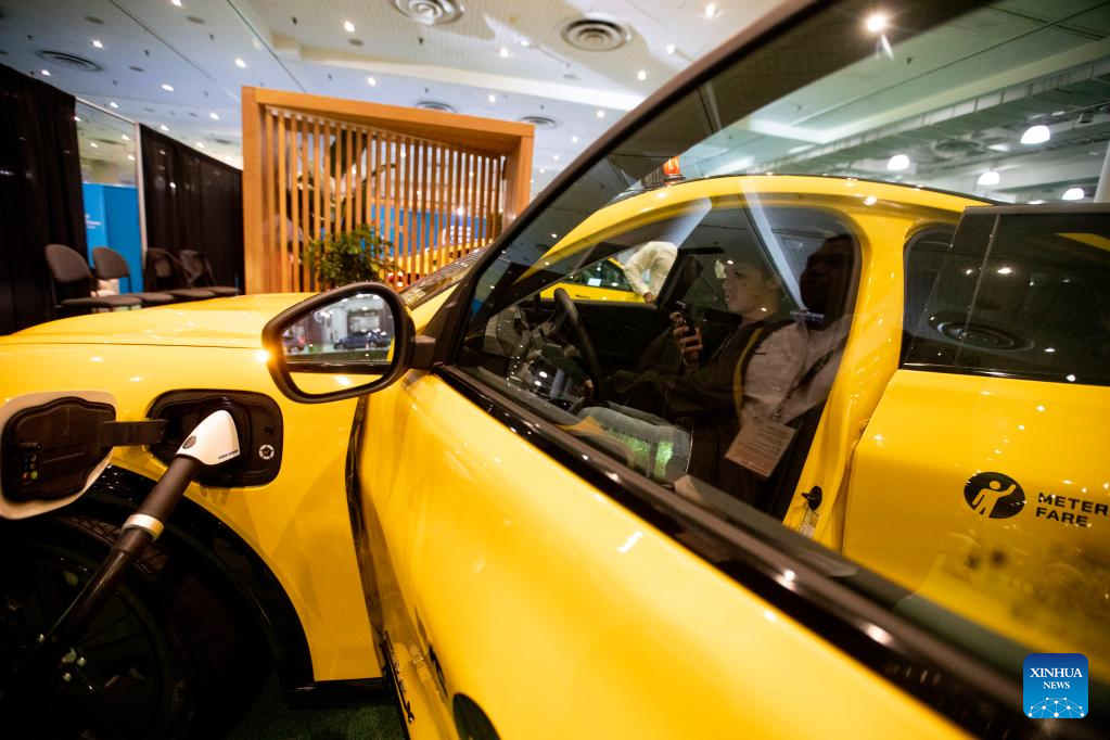 A visitor looks at an all-electric Taxi at the New York International Auto Show in New York, the United States, April 15, 2022. The New York International Auto Show (NYIAS) staged a comeback and opened to the general public on Friday after two years of interruption amid the COVID-19 pandemic.