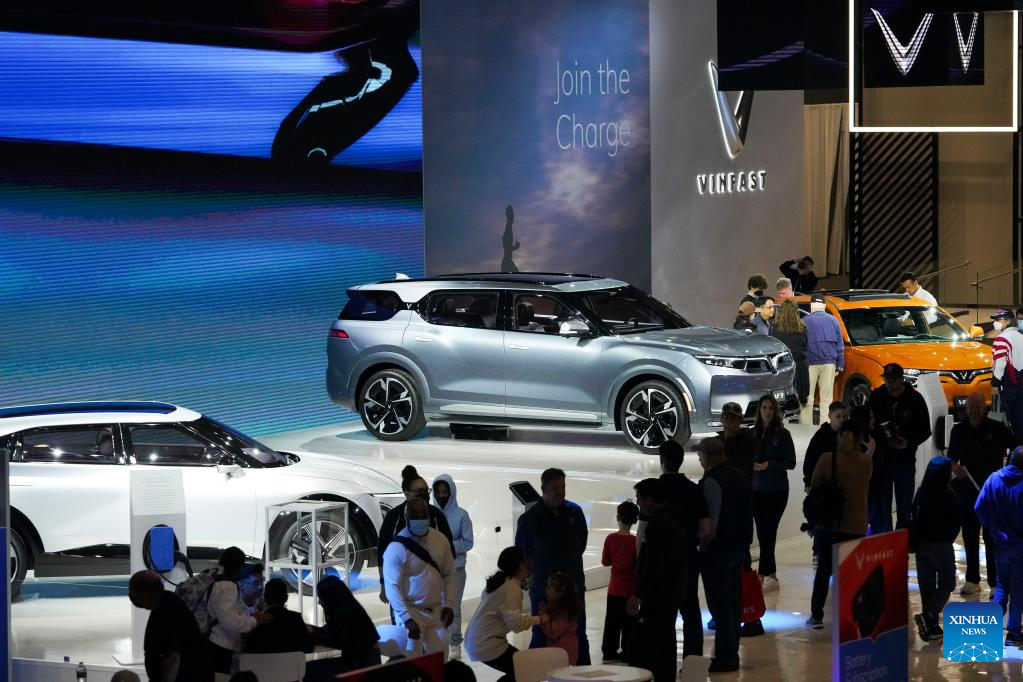 Visitors look at electric vehicles of VinFast at the New York International Auto Show in New York, the United States, April 15, 2022. The New York International Auto Show (NYIAS) staged a comeback and opened to the general public on Friday after two years of interruption amid the COVID-19 pandemic.