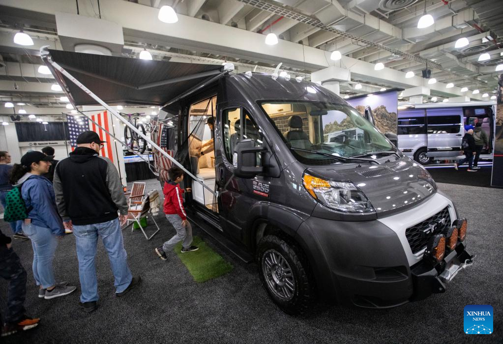 People look at a recreational vehicle at the New York International Auto Show in New York, the United States, April 15, 2022. The New York International Auto Show (NYIAS) staged a comeback and opened to the general public on Friday after two years of interruption amid the COVID-19 pandemic.