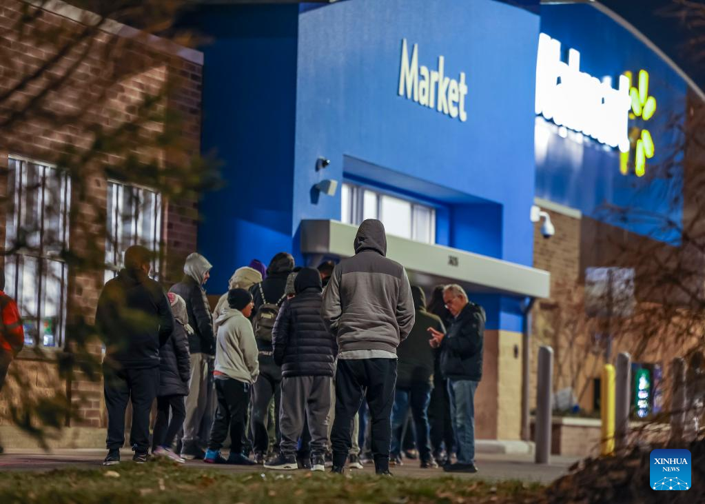 People line up for the opening of Black Friday sales at a Walmart store in Skokie in northern suburbs of Chicago, the United States, on Nov. 25, 2022. On average, American households are spending 433 U.S. dollars more per month to purchase the same items they did at the same time last year, an analysis by Moody's Analytics found. The analysis looked at October inflation data, as the United States sees the worst inflation in 40 years. (Photo by Joel Lerner/Xinhua)