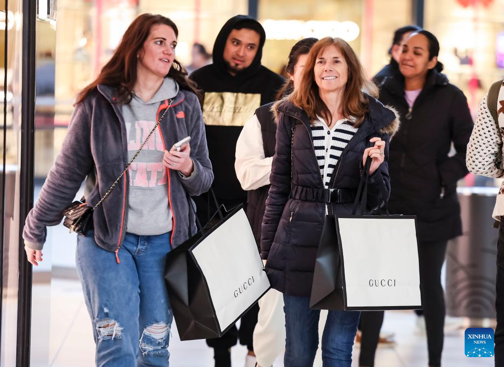 People walk with shopping bags during Black Friday sales at Chicago Fashion Outlets in Chicago, the United States, on Nov. 25, 2022. On average, American households are spending 433 U.S. dollars more per month to purchase the same items they did at the same time last year, an analysis by Moody's Analytics found. The analysis looked at October inflation data, as the United States sees the worst inflation in 40 years. (Photo by Joel Lerner/Xinhua)