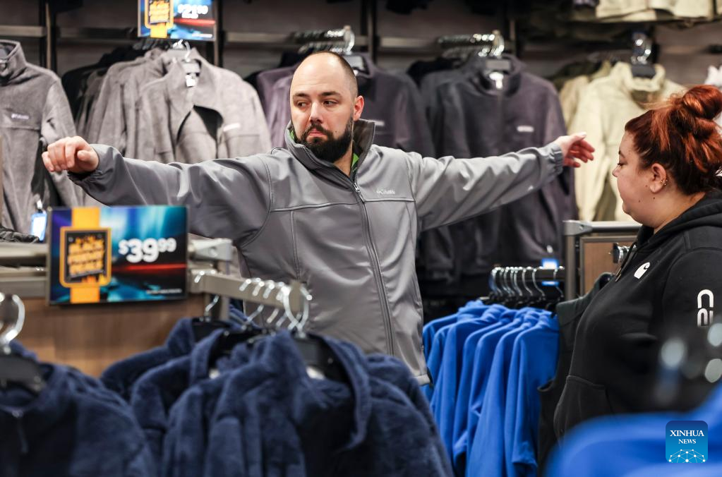 A man tries on a jacket at a store during Black Friday sales at Chicago Fashion Outlets in Chicago, the United States, on Nov. 25, 2022. On average, American households are spending 433 U.S. dollars more per month to purchase the same items they did at the same time last year, an analysis by Moody's Analytics found. The analysis looked at October inflation data, as the United States sees the worst inflation in 40 years. (Photo by Joel Lerner/Xinhua)