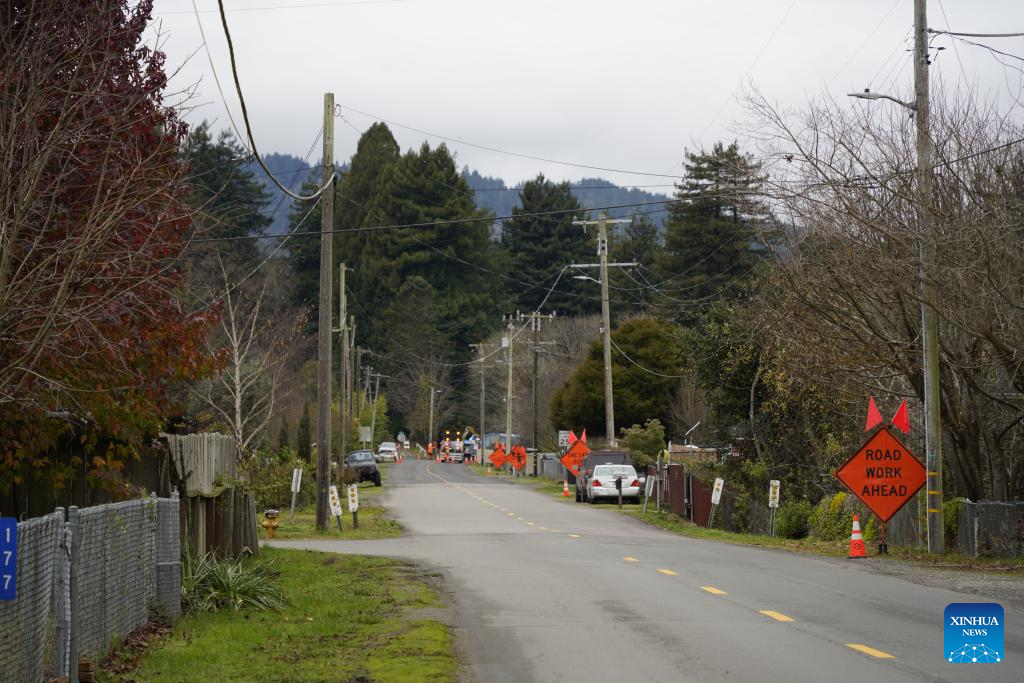 Construction crews repair public facilities damaged by an earthquake in Ferndale in Humboldt County, California, the United States, on Dec. 21, 2022. A 6.4-magnitude earthquake shook parts of Northern California early Tuesday, causing two deaths and 11 injuries and leaving tens of thousands without power. (Xinhua/Wu Xiaoling)