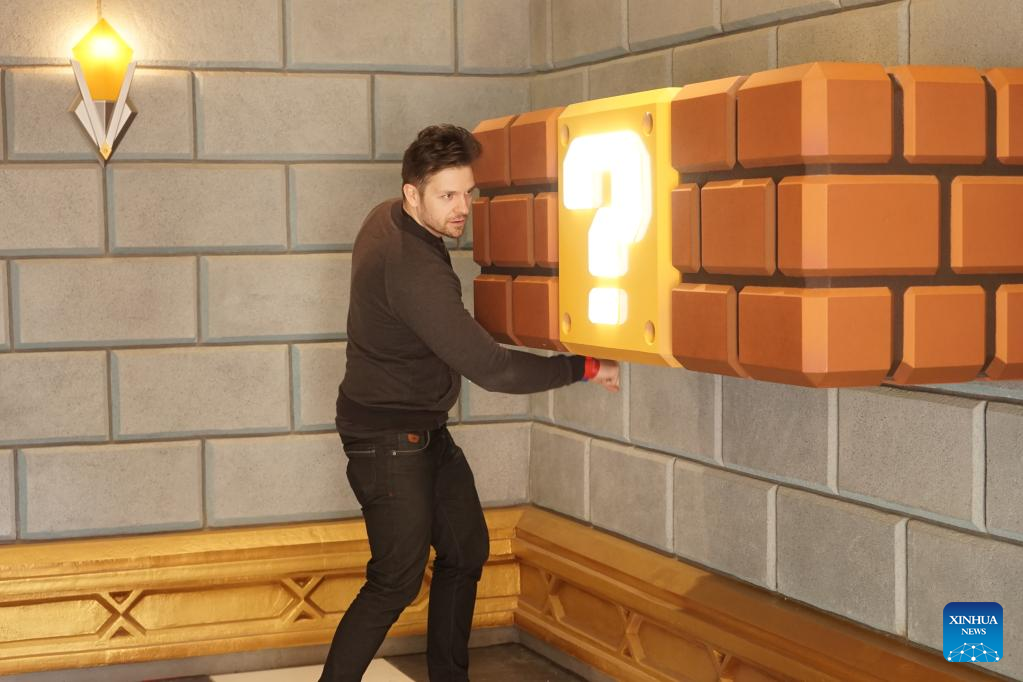 A man visits Super Nintendo World on Preview Day at Universal Studios Hollywood in Los Angeles, the United States, on Feb. 16, 2023. Universal Studios Hollywood officially opened its Super Nintendo World to the public on Friday, a new highly-immersive and interactive theme land. (Photo by Zeng Hui/Xinhua)