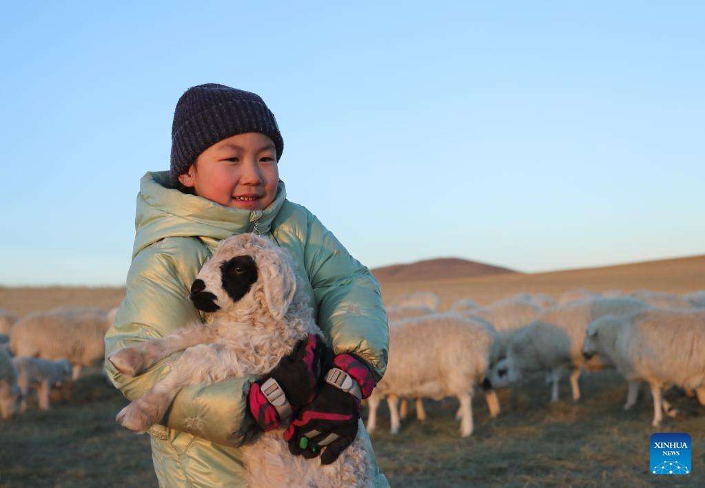 Herdsman Tsogdelger's daughter Halgian holds a lamb in the pasture in West Ujimqin Banner of Xilingol League, north China's Inner Mongolia Autonomous Region, March 29, 2023. In spring, the busiest season of the year, Tsogdelger, a herdsman of the Mongolian ethnic group, and his family need to assist with lambing and feed livestock every day. More than 280 lambs have been born in his farm since March 18. From the beginning of this year until March 30, a total of 581,300 offspring were born in West Ujimqin Banner, including 100,900 large livestock and 480,400 small livestock, with a survival rate of 99.18%. (Xinhua/Wang Kaiyan)