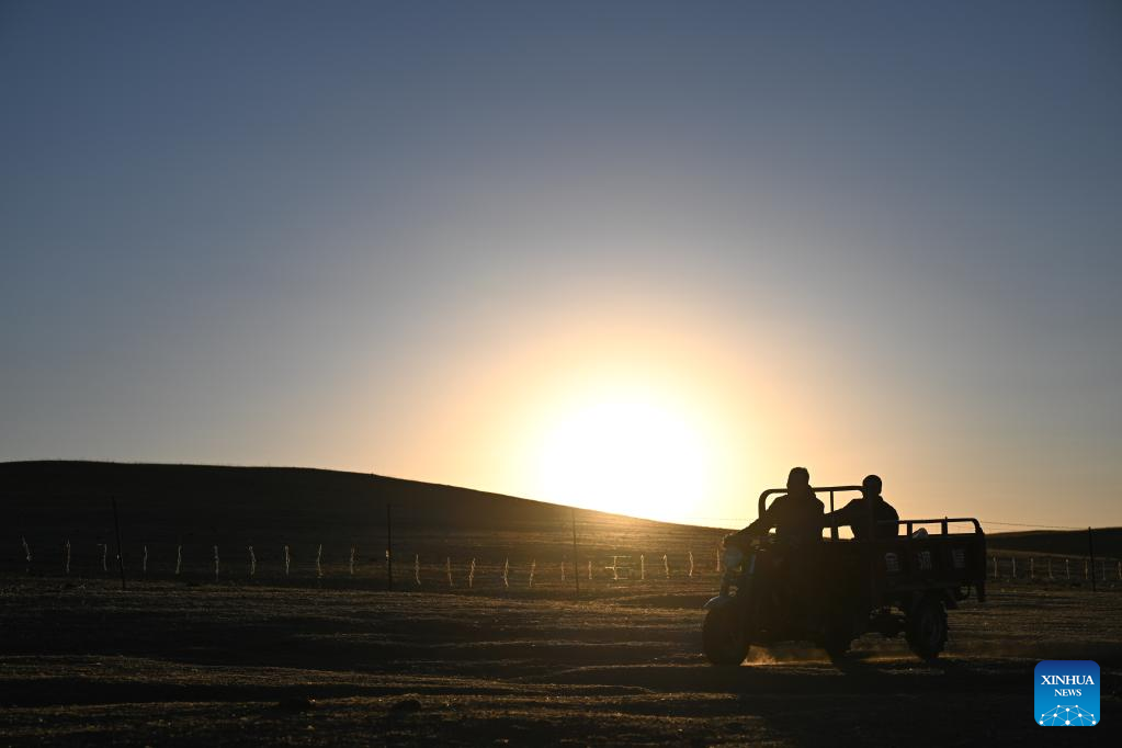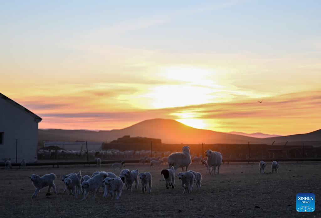 This photo taken on March 29, 2023 shows sunrise on the pasture of herdsman Tsogdelger in West Ujimqin Banner of Xilingol League, north China's Inner Mongolia Autonomous Region. In spring, the busiest season of the year, Tsogdelger, a herdsman of the Mongolian ethnic group, and his family need to assist with lambing and feed livestock every day. More than 280 lambs have been born in his farm since March 18. From the beginning of this year until March 30, a total of 581,300 offspring were born in West Ujimqin Banner, including 100,900 large livestock and 480,400 small livestock, with a survival rate of 99.18%. (Xinhua/Bei He)