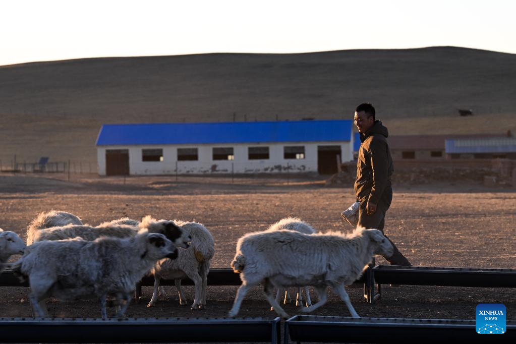 Herdsman Tsogdelger carries hay in his yard in West Ujimqin Banner of Xilingol League, north China's Inner Mongolia Autonomous Region, March 29, 2023. In spring, the busiest season of the year, Tsogdelger, a herdsman of the Mongolian ethnic group, and his family need to assist with lambing and feed livestock every day. More than 280 lambs have been born in his farm since March 18. From the beginning of this year until March 30, a total of 581,300 offspring were born in West Ujimqin Banner, including 100,900 large livestock and 480,400 small livestock, with a survival rate of 99.18%. (Xinhua/Bei He)