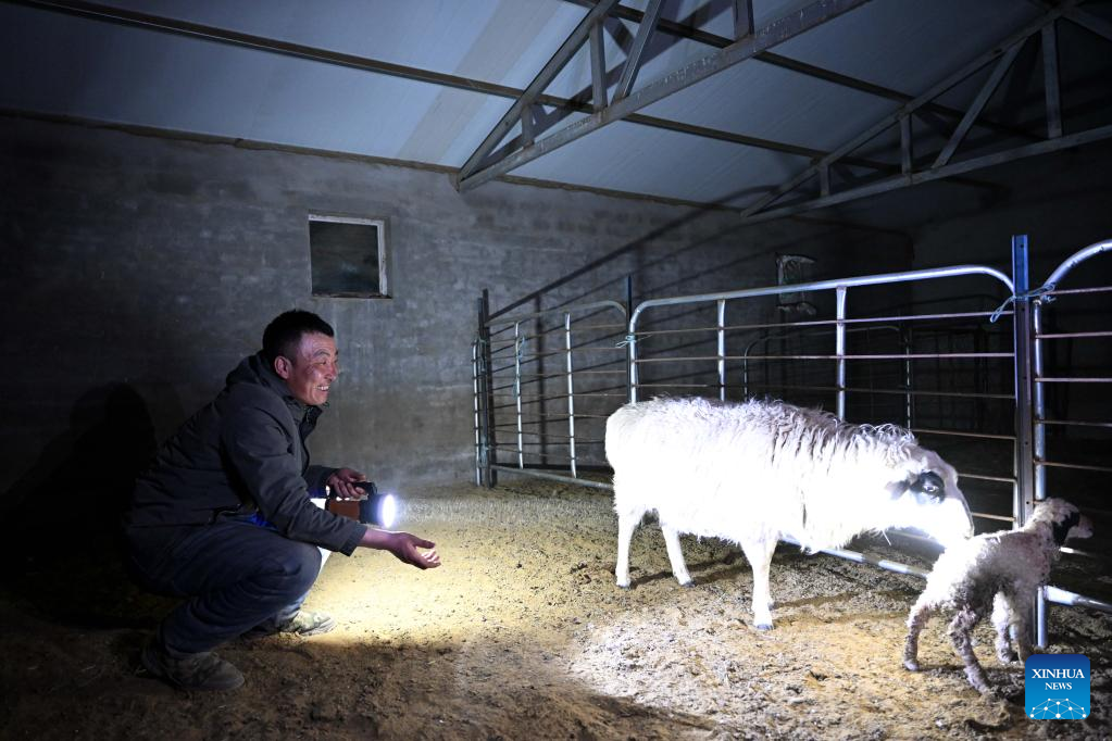 Herdsman Tsogdelger checks the situation of a ewe and a newborn lamb at night in West Ujimqin Banner of Xilingol League, north China's Inner Mongolia Autonomous Region, March 28, 2023. In spring, the busiest season of the year, Tsogdelger, a herdsman of the Mongolian ethnic group, and his family need to assist with lambing and feed livestock every day. More than 280 lambs have been born in his farm since March 18. From the beginning of this year until March 30, a total of 581,300 offspring were born in West Ujimqin Banner, including 100,900 large livestock and 480,400 small livestock, with a survival rate of 99.18%. (Xinhua/Bei He)