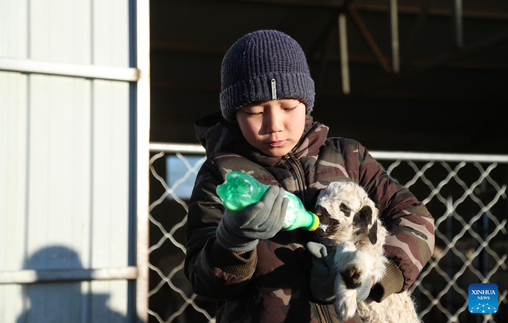 Hanagar, son of herdsman Tsogdelger, feeds a lamb in West Ujimqin Banner of Xilingol League, north China's Inner Mongolia Autonomous Region, March 29, 2023. In spring, the busiest season of the year, Tsogdelger, a herdsman of the Mongolian ethnic group, and his family need to assist with lambing and feed livestock every day. More than 280 lambs have been born in his farm since March 18. From the beginning of this year until March 30, a total of 581,300 offspring were born in West Ujimqin Banner, including 100,900 large livestock and 480,400 small livestock, with a survival rate of 99.18%. (Xinhua/Wang Kaiyan)