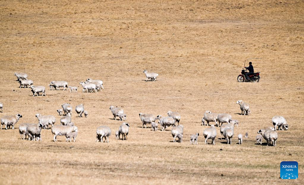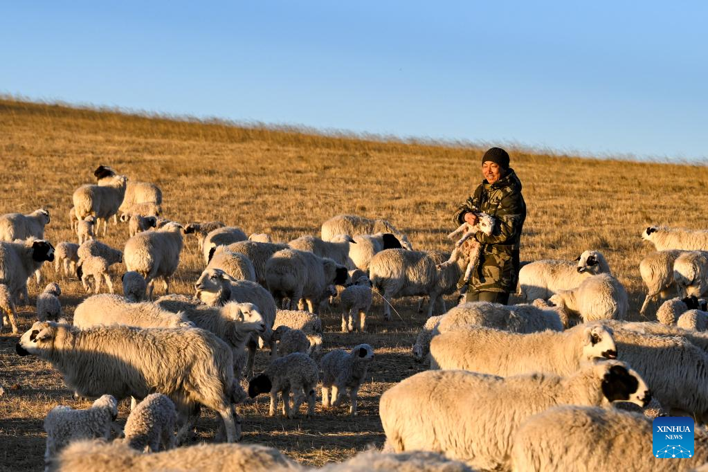 Herdsman Tsogdelger herds sheep in the pasture in West Ujimqin Banner of Xilingol League, north China's Inner Mongolia Autonomous Region, March 28, 2023. In spring, the busiest season of the year, Tsogdelger, a herdsman of the Mongolian ethnic group, and his family need to assist with lambing and feed livestock every day. More than 280 lambs have been born in his farm since March 18. From the beginning of this year until March 30, a total of 581,300 offspring were born in West Ujimqin Banner, including 100,900 large livestock and 480,400 small livestock, with a survival rate of 99.18%. (Xinhua/Wang Kaiyan)