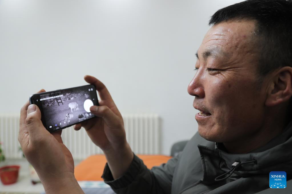 Herdsman Tsogdelger shows the sheepfold monitoring image on the mobile phone in West Ujimqin Banner of Xilingol League, north China's Inner Mongolia Autonomous Region, March 28, 2023. In spring, the busiest season of the year, Tsogdelger, a herdsman of the Mongolian ethnic group, and his family need to assist with lambing and feed livestock every day. More than 280 lambs have been born in his farm since March 18. From the beginning of this year until March 30, a total of 581,300 offspring were born in West Ujimqin Banner, including 100,900 large livestock and 480,400 small livestock, with a survival rate of 99.18%. (Xinhua/Wang Kaiyan)