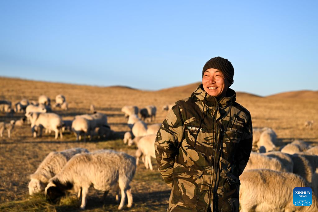 Herdsman Tsogdelger smiles in the pasture in West Ujimqin Banner of Xilingol League, north China's Inner Mongolia Autonomous Region, March 29, 2023. In spring, the busiest season of the year, Tsogdelger, a herdsman of the Mongolian ethnic group, and his family need to assist with lambing and feed livestock every day. More than 280 lambs have been born in his farm since March 18. From the beginning of this year until March 30, a total of 581,300 offspring were born in West Ujimqin Banner, including 100,900 large livestock and 480,400 small livestock, with a survival rate of 99.18%. (Xinhua/Bei He)
