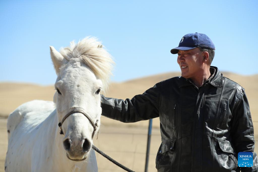 Tumenbayaryn, father of herdsman Tsogdelger, pets his horse in West Ujimqin Banner of Xilingol League, north China's Inner Mongolia Autonomous Region, March 29, 2023. In spring, the busiest season of the year, Tsogdelger, a herdsman of the Mongolian ethnic group, and his family need to assist with lambing and feed livestock every day. More than 280 lambs have been born in his farm since March 18. From the beginning of this year until March 30, a total of 581,300 offspring were born in West Ujimqin Banner, including 100,900 large livestock and 480,400 small livestock, with a survival rate of 99.18%. (Xinhua/Wang Kaiyan)