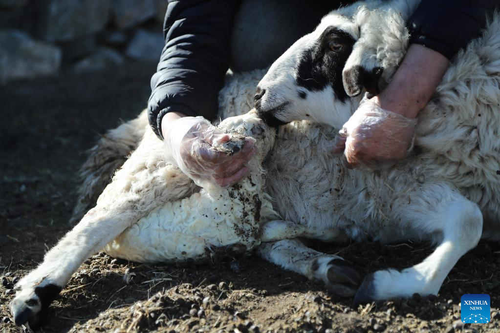 Herdsman Tsogdelger checks a lamb in West Ujimqin Banner of Xilingol League, north China's Inner Mongolia Autonomous Region, March 29, 2023. In spring, the busiest season of the year, Tsogdelger, a herdsman of the Mongolian ethnic group, and his family need to assist with lambing and feed livestock every day. More than 280 lambs have been born in his farm since March 18. From the beginning of this year until March 30, a total of 581,300 offspring were born in West Ujimqin Banner, including 100,900 large livestock and 480,400 small livestock, with a survival rate of 99.18%. (Xinhua/Wang Kaiyan)