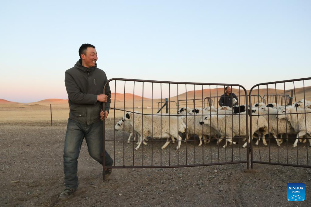 Herdsman Tsogdelger checks sheep in his pasture in West Ujimqin Banner of Xilingol League, north China's Inner Mongolia Autonomous Region, March 29, 2023. In spring, the busiest season of the year, Tsogdelger, a herdsman of the Mongolian ethnic group, and his family need to assist with lambing and feed livestock every day. More than 280 lambs have been born in his farm since March 18. From the beginning of this year until March 30, a total of 581,300 offspring were born in West Ujimqin Banner, including 100,900 large livestock and 480,400 small livestock, with a survival rate of 99.18%. (Xinhua/Bei He)
