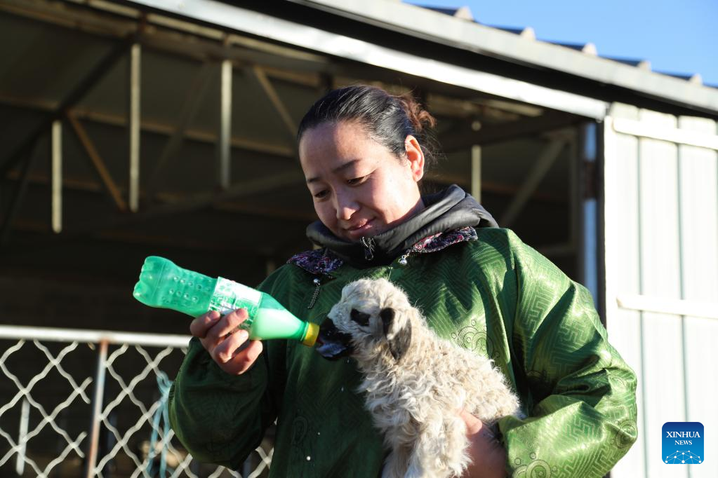 Herdsman Tsogdelger's wife Munguntuya feeds a lamb in West Ujimqin Banner of Xilingol League, north China's Inner Mongolia Autonomous Region, March 29, 2023. In spring, the busiest season of the year, Tsogdelger, a herdsman of the Mongolian ethnic group, and his family need to assist with lambing and feed livestock every day. More than 280 lambs have been born in his farm since March 18. From the beginning of this year until March 30, a total of 581,300 offspring were born in West Ujimqin Banner, including 100,900 large livestock and 480,400 small livestock, with a survival rate of 99.18%. (Xinhua/Wang Kaiyan)