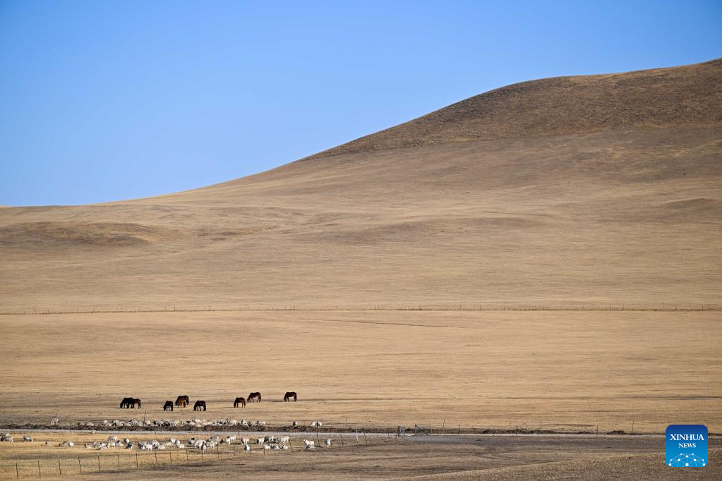 This photo taken on March 28, 2023 shows sheep and horses of herdsman Tsogdelger in West Ujimqin Banner of Xilingol League, north China's Inner Mongolia Autonomous Region. In spring, the busiest season of the year, Tsogdelger, a herdsman of the Mongolian ethnic group, and his family need to assist with lambing and feed livestock every day. More than 280 lambs have been born in his farm since March 18. From the beginning of this year until March 30, a total of 581,300 offspring were born in West Ujimqin Banner, including 100,900 large livestock and 480,400 small livestock, with a survival rate of 99.18%. (Xinhua/Bei He)
