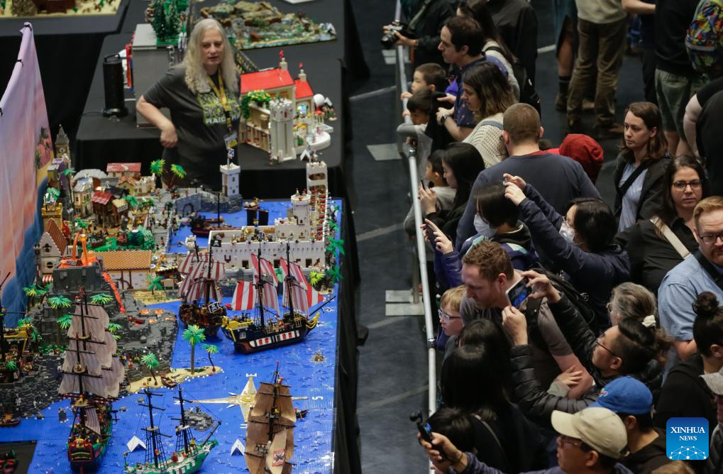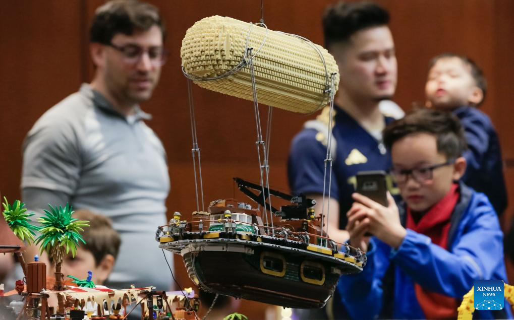People view LEGO creations at the BrickCan LEGO exhibition at the River Rock Theatre in Richmond, British Columbia, Canada, on April 20, 2024. (Photo by Liang Sen/Xinhua)