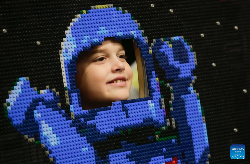 A boy poses for photos behind a LEGO brick display at the River Rock Theatre in Richmond, British Columbia, Canada, on April 20, 2024. (Photo by Liang Sen/Xinhua)