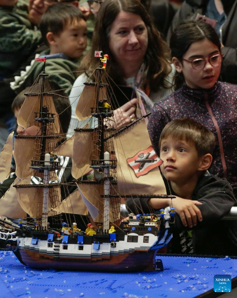 A boy looks at a LEGO ship creation at the BrickCan LEGO exhibition at the River Rock Theatre in Richmond, British Columbia, Canada, on April 20, 2024. (Photo by Liang Sen/Xinhua)