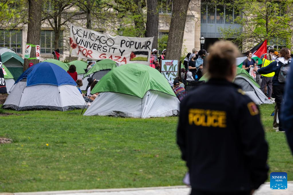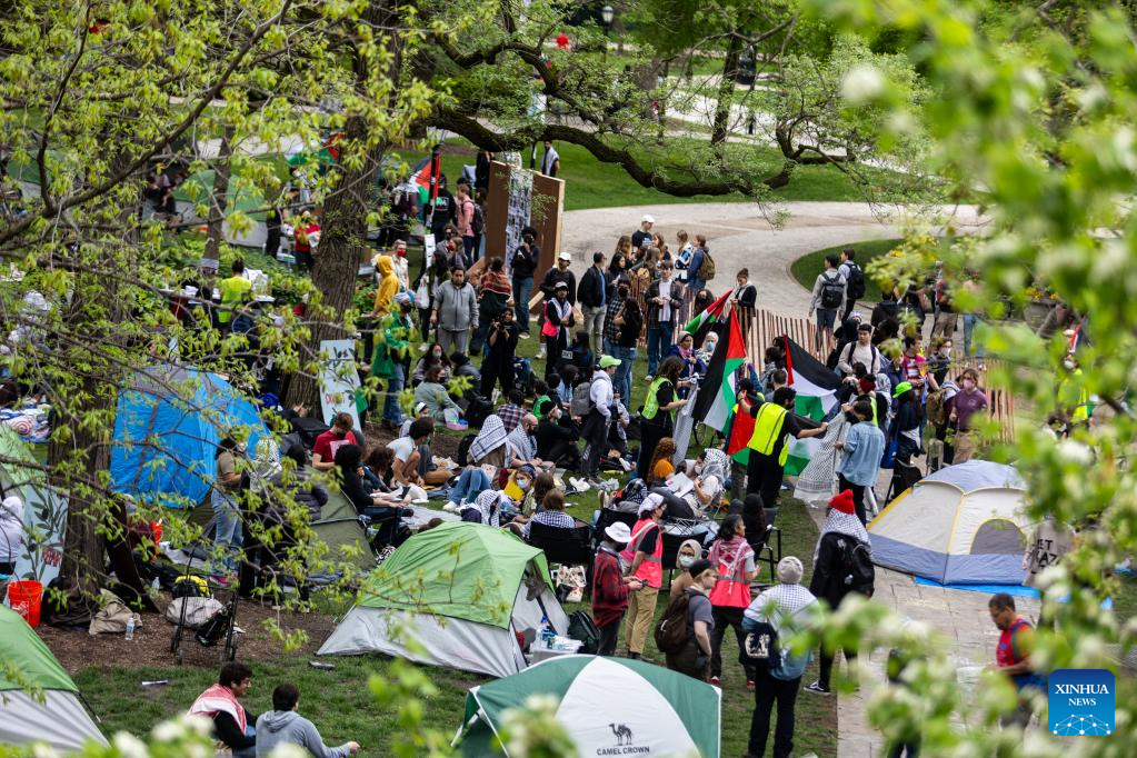 CHICAGO, April 29 (Xinhua) -- Hundreds of University of Chicago (UChicago) students set up an encampment in the center of the campus on Monday, joining groups on over 100 university campuses across the United States in support of Palestinians.