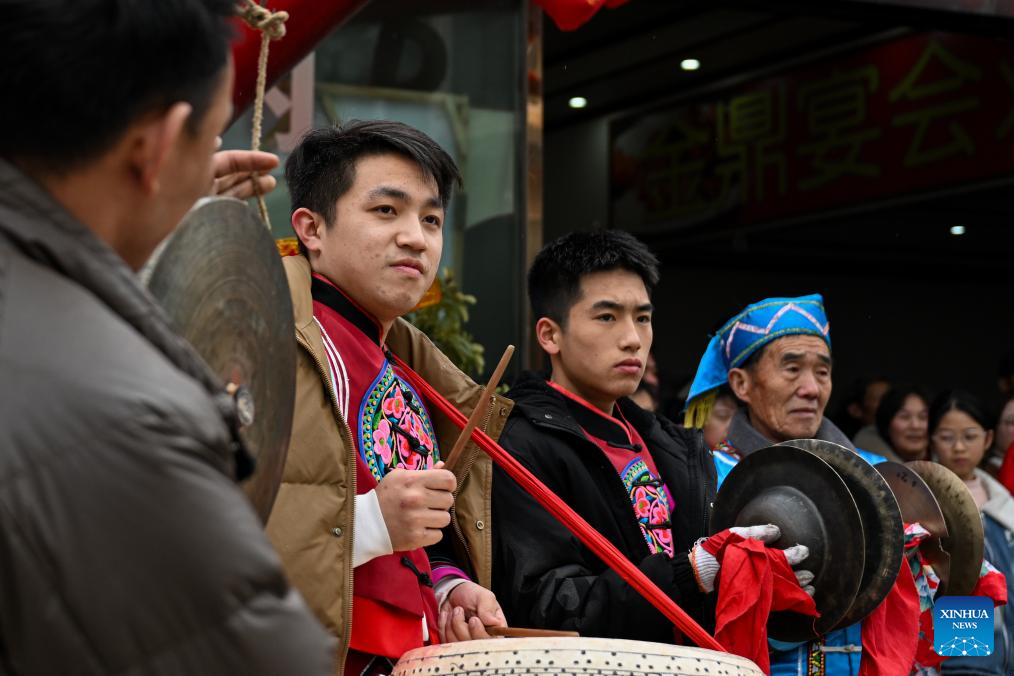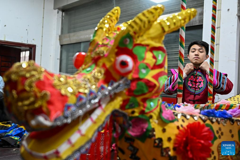 A folk artist of Lichuan Dengge makes preparation before performance in Baiyangba Town, Lichuan City, Enshi Tujia and Miao Autonomous Prefecture, central China's Hubei Province, Feb. 6, 2025. Lichuan Dengge, originated from Lichuan City of Hubei Province, is a vibrant traditional folk art performed during festivals with colorful props like dragon boats and lantern carts. It features lively songs and interactive performances, reflecting the rich cultural heritage of the Tujia ethnic group. In 2011, Lichuan Dengge was listed among the third batch of national intangible cultural heritage. (Xinhua/Du Zixuan)