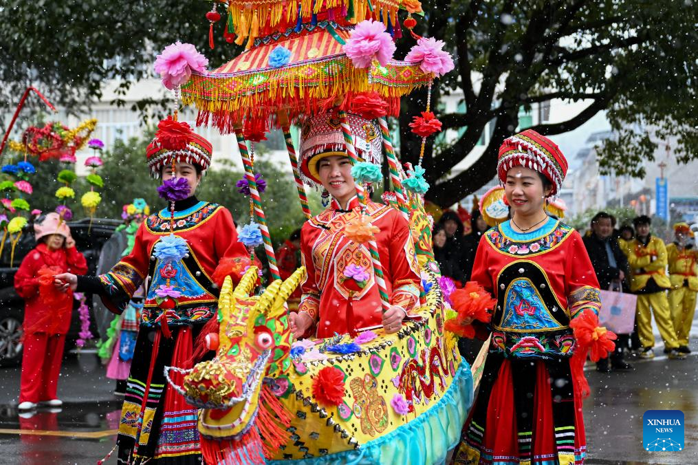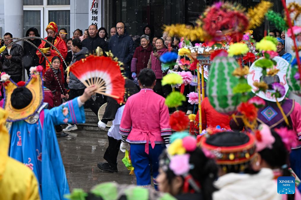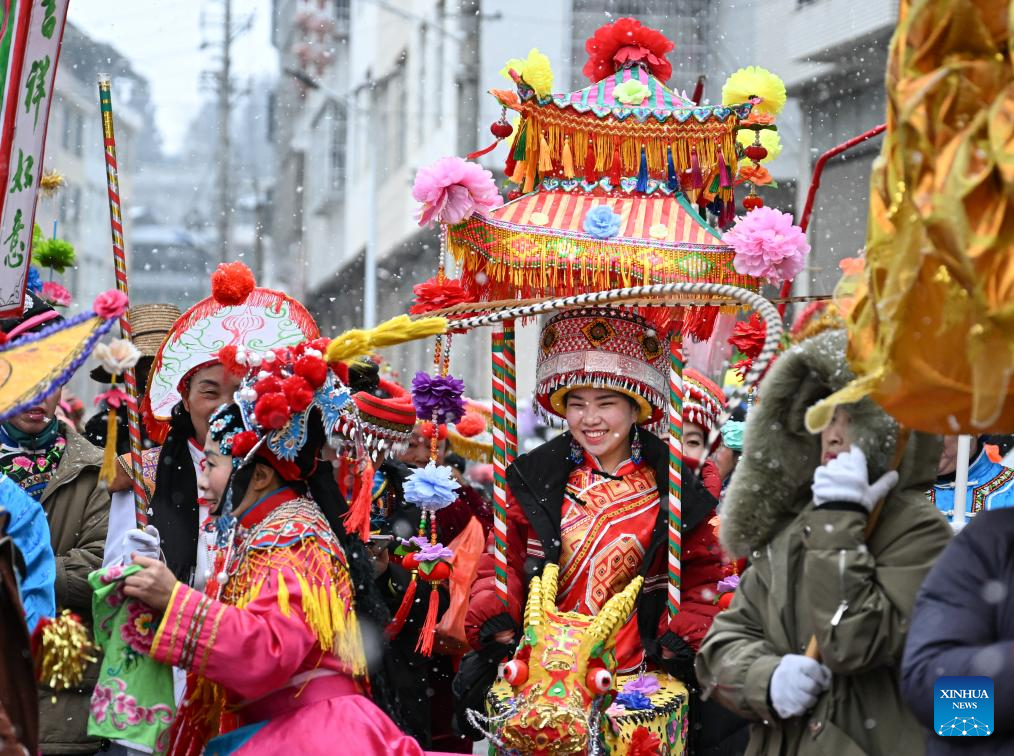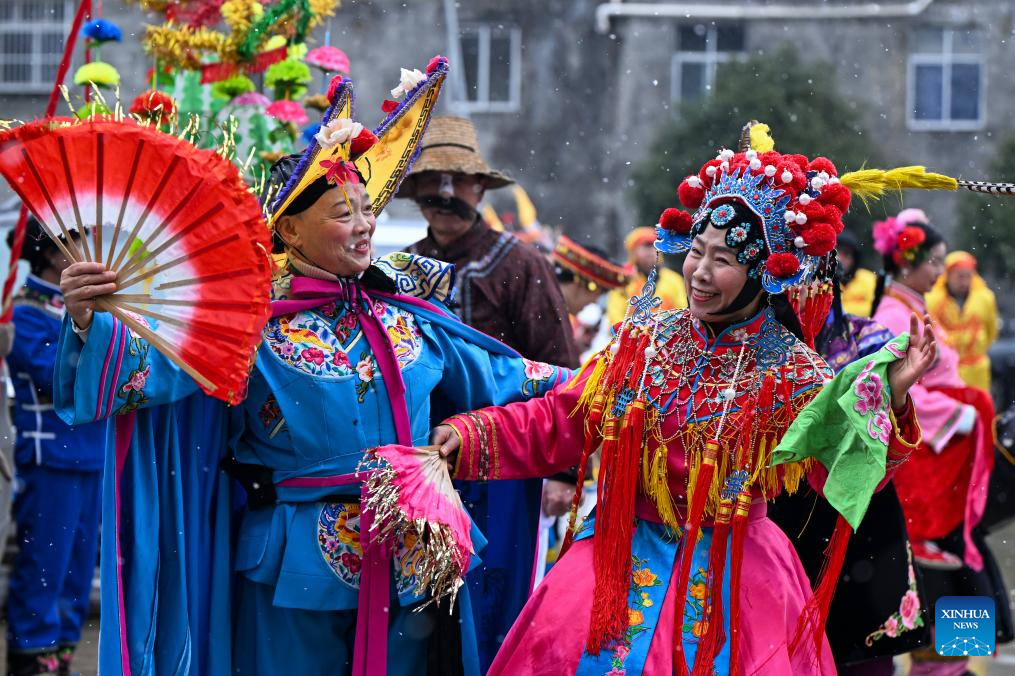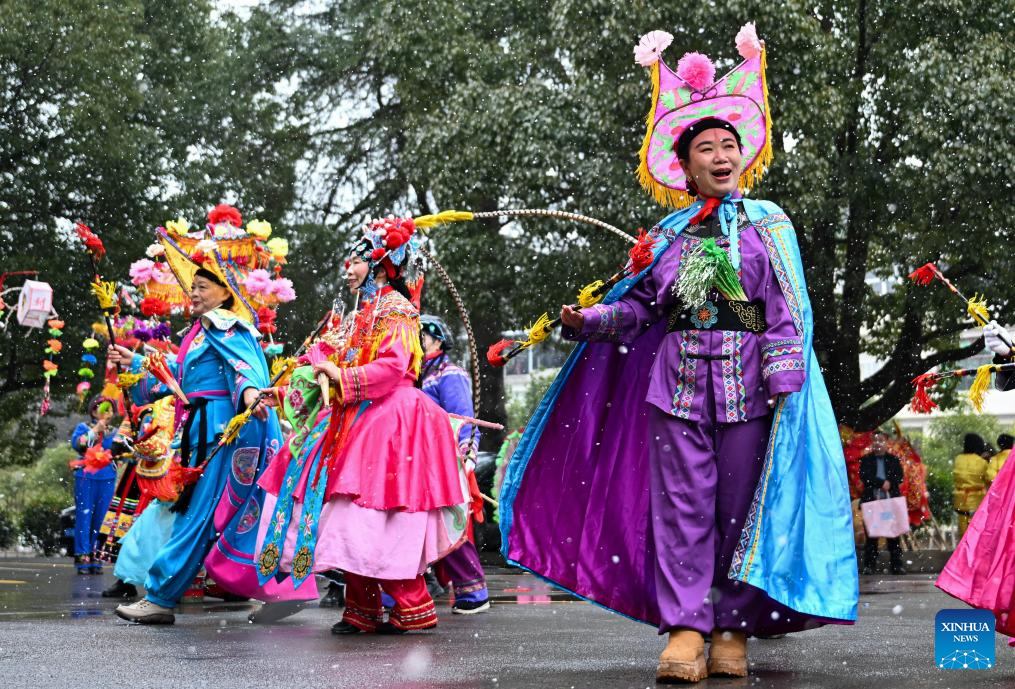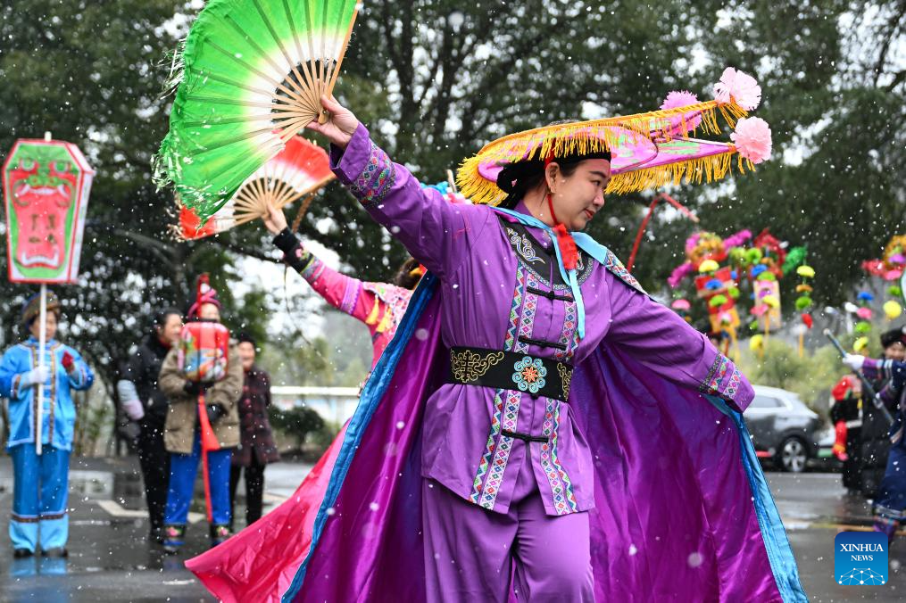 Folk artists of Lichuan Dengge perform in Baiyangba Town, Lichuan City, Enshi Tujia and Miao Autonomous Prefecture, central China's Hubei Province, Feb. 6, 2025. Lichuan Dengge, originated from Lichuan City of Hubei Province, is a vibrant traditional folk art performed during festivals with colorful props like dragon boats and lantern carts. It features lively songs and interactive performances, reflecting the rich cultural heritage of the Tujia ethnic group. In 2011, Lichuan Dengge was listed among the third batch of national intangible cultural heritage. (Xinhua/Du Zixuan)
