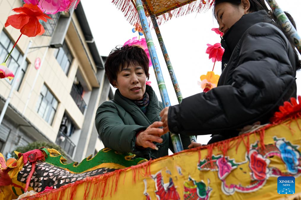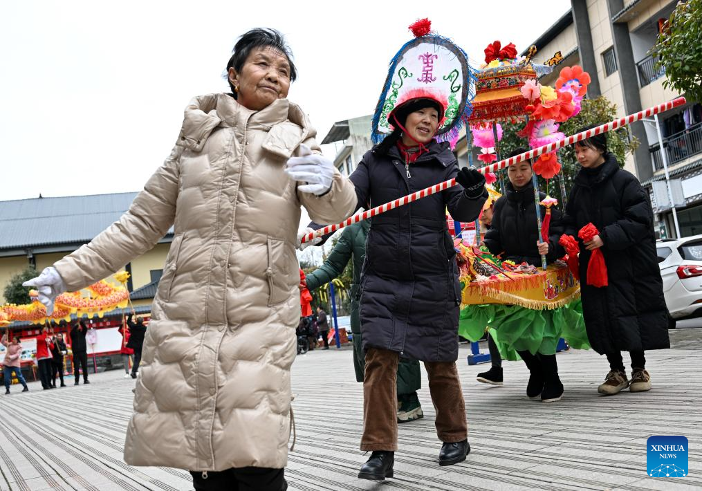Folk artists practice Lichuan Dengge in Baiyangba Town, Lichuan City, Enshi Tujia and Miao Autonomous Prefecture, central China's Hubei Province, Feb. 7, 2025. Lichuan Dengge, originated from Lichuan City of Hubei Province, is a vibrant traditional folk art performed during festivals with colorful props like dragon boats and lantern carts. It features lively songs and interactive performances, reflecting the rich cultural heritage of the Tujia ethnic group. In 2011, Lichuan Dengge was listed among the third batch of national intangible cultural heritage. (Xinhua/Du Zixuan)
