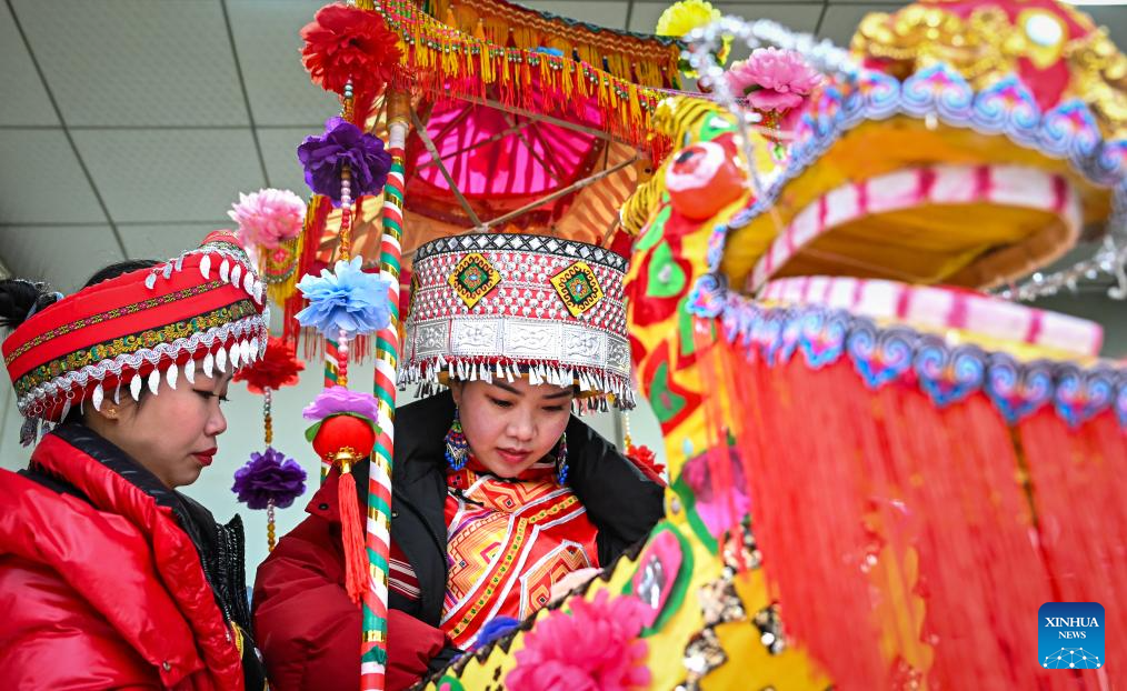 Folk artists of Lichuan Dengge make preparation before performance in Baiyangba Town, Lichuan City, Enshi Tujia and Miao Autonomous Prefecture, central China's Hubei Province, Feb. 6, 2025. Lichuan Dengge, originated from Lichuan City of Hubei Province, is a vibrant traditional folk art performed during festivals with colorful props like dragon boats and lantern carts. It features lively songs and interactive performances, reflecting the rich cultural heritage of the Tujia ethnic group. In 2011, Lichuan Dengge was listed among the third batch of national intangible cultural heritage. (Xinhua/Du Zixuan)