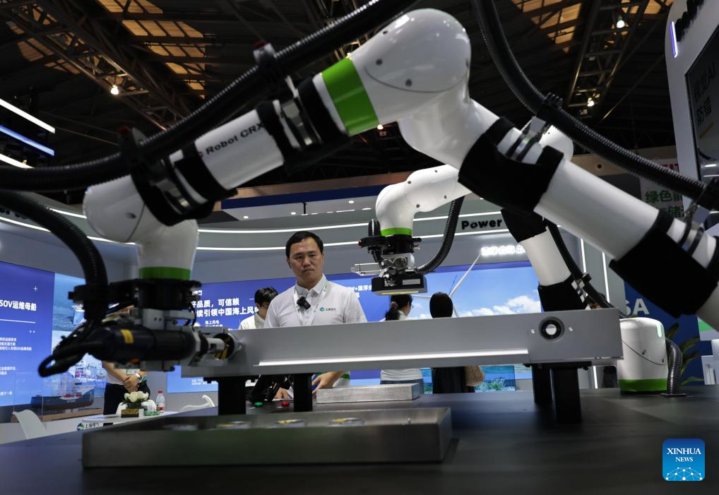 A staff member looks over as collaborative robots demonstrate battery pack assembling and wiring check operations during the 11th China (Shanghai) International Technology Fair (CSITF) in east China's Shanghai, June 11, 2025. The 11th CSITF kicked off here on Wednesday. With an exhibition area covering 35,000 square meters, this year's fair features four themed exhibition areas, a trading service area and a trading facilitation events area. Some 1,000 exhibitors from nearly 20 countries and regions showcased their innovative achievements here. (Xinhua/Fang Zhe)
