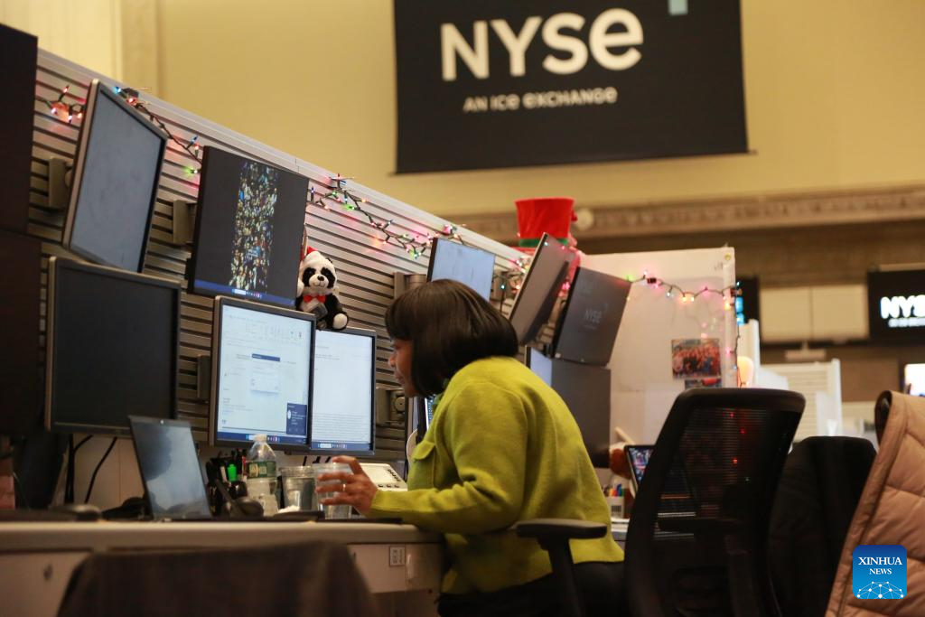 A trader works on the floor of the New York Stock Exchange in New York, the United States, Dec. 31, 2025. U.S. stocks ended lower on Wednesday. The Dow Jones Industrial Average fell by 303.77 points, or 0.63 percent, to 48,063.29. The S&P 500 sank 50.74 points, or 0.74 percent, to 6,845.5. The Nasdaq Composite Index shed 177.089 points, or 0.76 percent, to 23,241.991. (Xinhua/Liu Yanan)