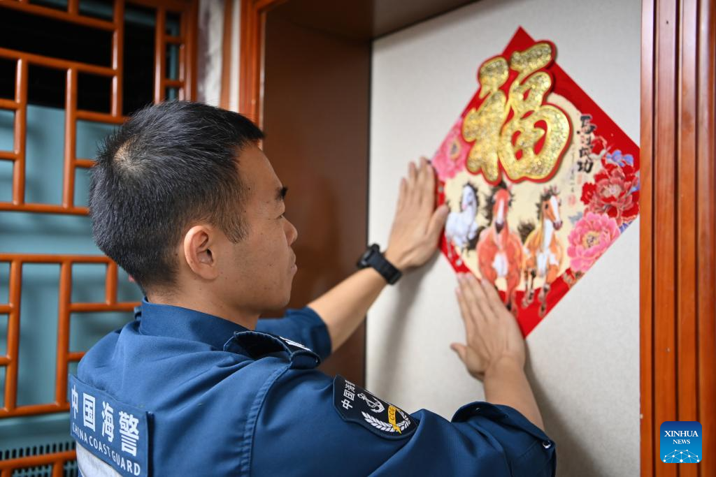 Law enforcer Zhang Shengfeng posts a Spring Festival decoration featuring the Chinese character "Fu", which means good fortune, aboard the China Coast Guard (CCG) vessel Wanshan in the territorial waters of China's Huangyan Dao on Feb. 11, 2026.