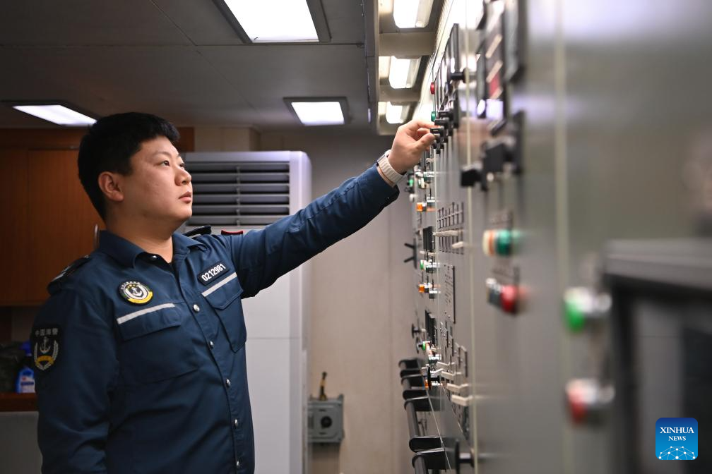 Law enforcer Liu Chunyu operates a power distribution board aboard the China Coast Guard (CCG) vessel Wanshan in the territorial waters of China's Huangyan Dao on Feb. 12, 2026.
