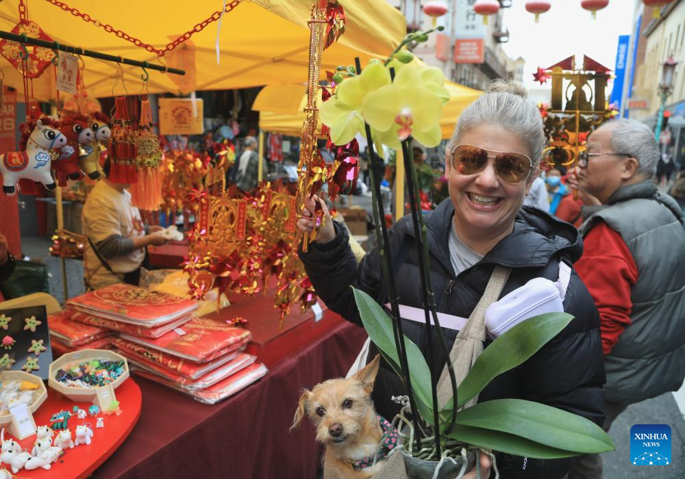 A visitor selects potted plants at the Chinatown Flower Market Fair 2026 in San Francisco, the United States, Feb. 15, 2026.