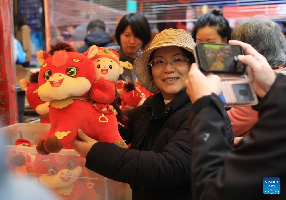 A visitor poses for photos with a horse-themed toy at the Chinatown Flower Market Fair 2026 in San Francisco, the United States, Feb. 15, 2026.
