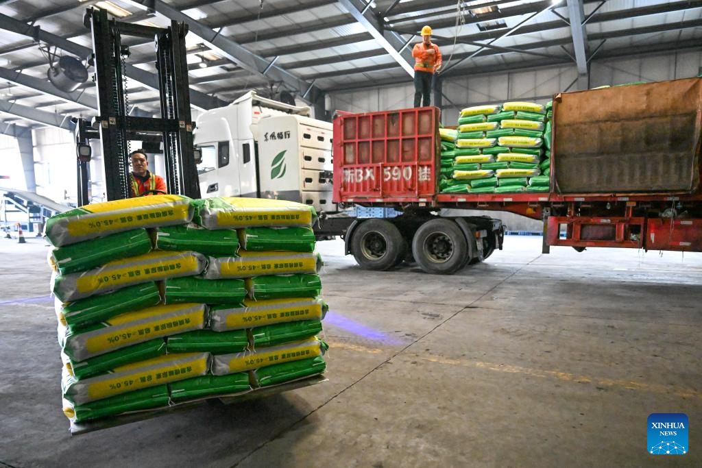Employees load bags of fertilizers onto a truck at a fertilizer company in Manas County of Changji Hui Autonomous Prefecture, northwest China's Xinjiang Uygur Autonomous Region, on March 4, 2026. Agricultural supply manufacturers in Xinjiang are working at full capacity to fulfill orders and ensure a steady flow of fertilizers and materials for spring farming.
