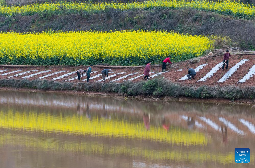 Farmers work in a field in Tiangongmiao Village, Lede Town, Rongxian County of southwest China's Sichuan Province, March 6, 2026. (Xinhua/Jiang Hongjing)